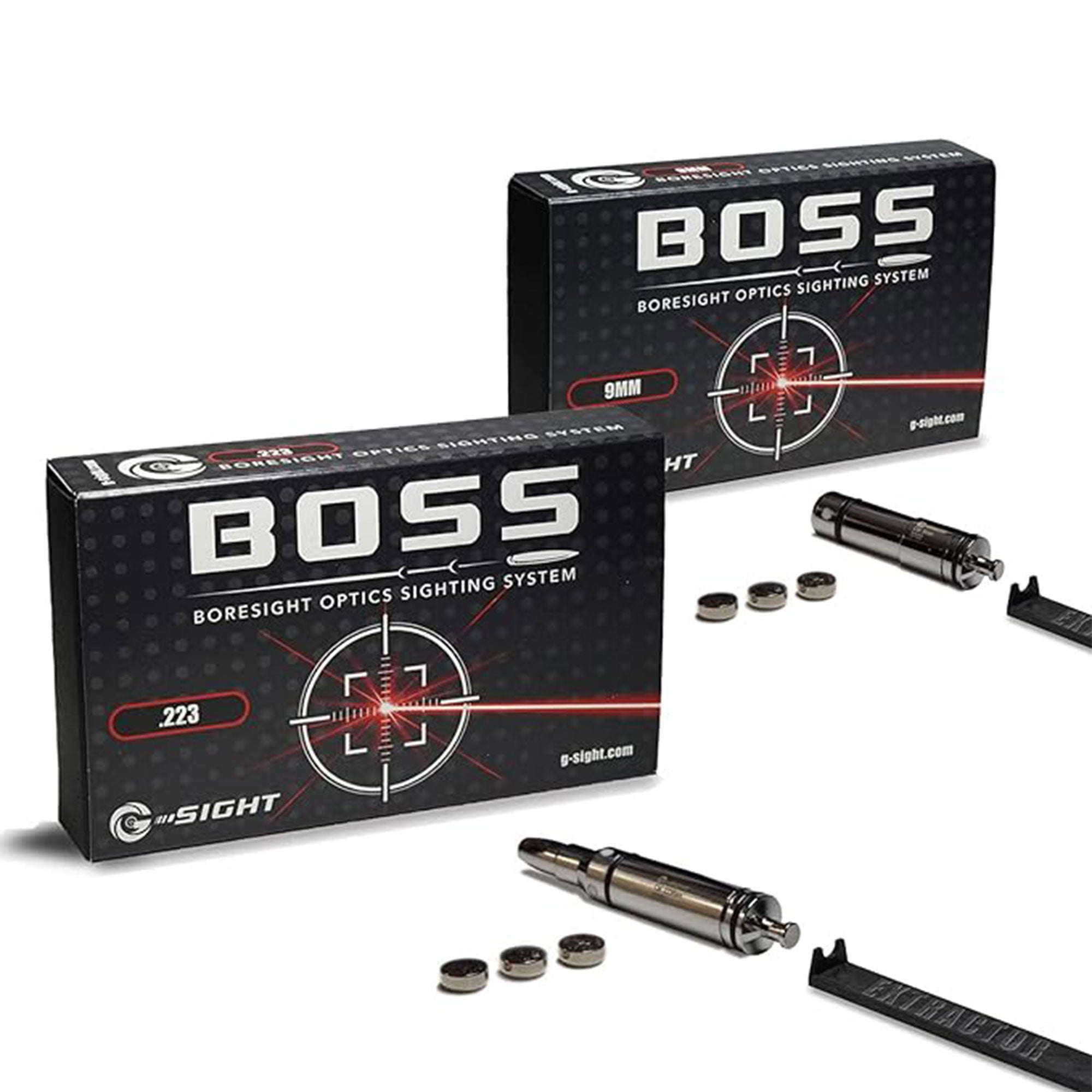 Each BOSS 2 PACK 9mm & .223 Boresight comes with; One Laser Boresight, One Chamber Extractor Tool