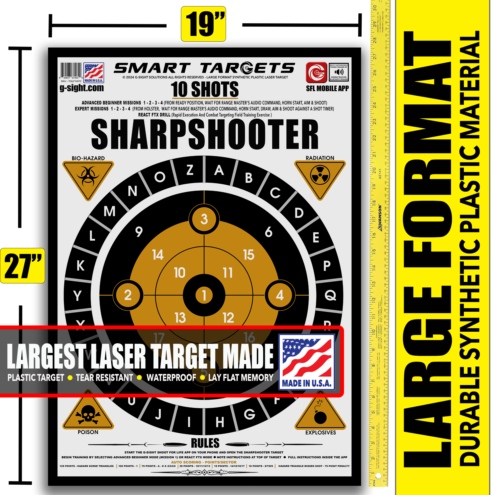 SHARPSHOOTER has been specifically designed to work with our 100% FREE G-Sight SFL Mobile App, for iOS and Android, taking our customer base into a different realm of advanced game play and training! The App is packed full of features like auto Target ALIGNMENT, auto SCORING with game play functions and features like randomized Zone Targeting, AUDIO COMMANDS and Advanced Missions that will challenge even the most accomplished shooters in the world!